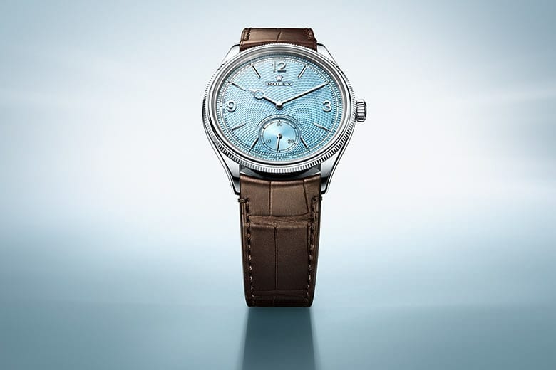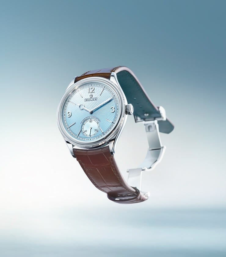 Com seus algarismos 3, 9 e 12 e seu totalizador de pequenos segundos às 6 horas, o 1908 disponível em ouro amarelo ou branco 18 quilates, ou ainda em platina 950, revisita o estilo do Oyster Perpetual lançado em 1931 para reinventá-lo com ares de modernidade. O mostrador simboliza elegância e sofisticação. Ele vem munido de algarismos arábicos e indicadores facetados em ouro 18 quilates, acompanhado por um fundo branco ou preto intenso, ou até azul glacial com motivo grão de arroz trabalhado em guilhochê. Protegido por um vidro de safira abaulado, ele possui ainda uma fina minuteria “trilho de trem” ao longo de toda a sua circunferência. O 1908 combina ponteiros de diferentes estilos: um ponteiro dos minutos em forma de espada e um ponteiro com um círculo vazado para marcar as horas.