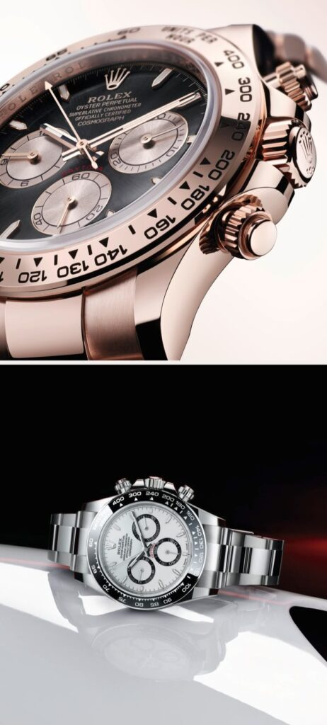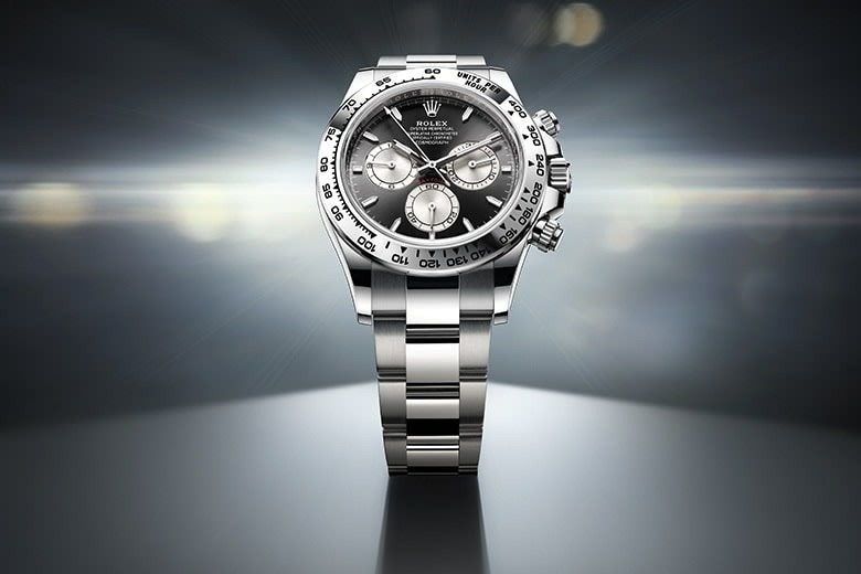 O Cosmograph Daytona é equipado com o calibre 4131. Esse mecanismo cronógrafo, inteiramente projetado e manufaturado pela Rolex, é o herdeiro do calibre 4130. Apresentado em 2023, ele incorpora algumas das principais inovações proporcionadas pela Rolex para seus mecanismos: o escape Chronergy, o sistema de absorção de choques Paraflex e um rolamento de esferas otimizado.
